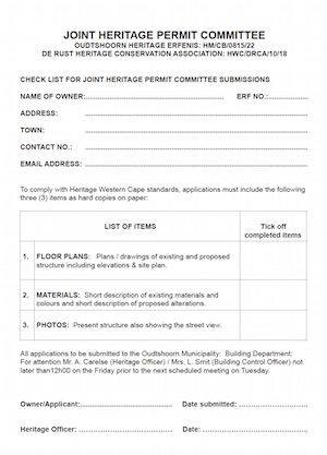 - Have a Draft Plan drawn which following further discussion with De Rust Heritage should be submitted to the Heritage Officer at the Oudtshoorn Municipality for submission to the Joint Heritage Permit Committee including photographs of the street scape and adjoining properties (see below for sample Checklist Form)
